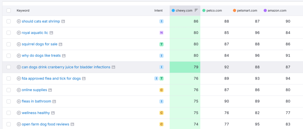 This is a genuinely defensible organic position. Competitors like Petco and PetSmart rank for many of the same product-related terms, but they are nowhere near Chewy’s authority on health content. The data showed Chewy holding top rankings on health queries where the competition either does not appear at all or falls well outside the top 10. It’s not a gap that Petco or PetSmart can close quickly, because content authority of that kind takes time to build.